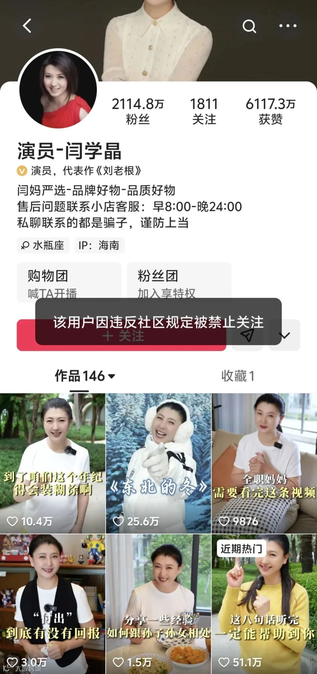 事件发酵后不到一个月,闫学晶抖音、快手账号均被平台标注“因违反社区规定被禁止关注”,评论区关闭,带货橱窗清空。截至2026年1月,其抖音粉丝由约380万跌至355.8万,两大平台合计掉粉超20万。