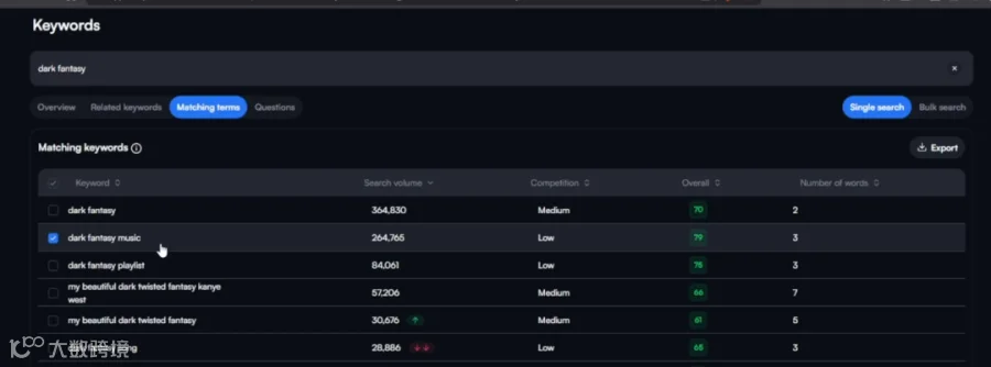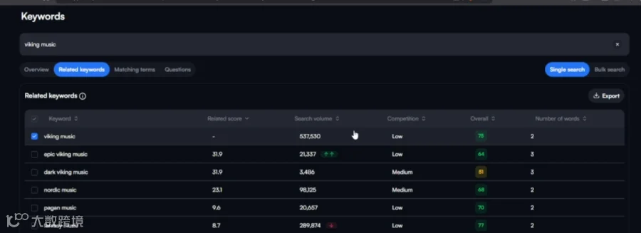 第一步,先用VidIQ做关键词研究,找那些竞争小、搜索量大的关键词。比如作者演示的两个词:Viking music(维京音乐)和Dark fantasy music(暗黑幻想音乐)。这两个词都比较有特色,搜索量比较大,当做的人不多,值得去做。但要是等几千人都挤进来,那可就成红海了。