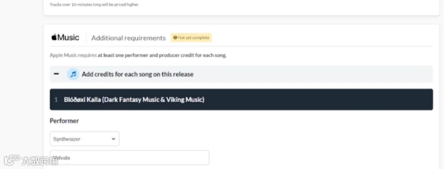第五步:极速上架。 作者用的是DistroKid。选好meta JSON文件,填上艺人名字,手动编辑每首歌只用一个关键词,交替用“黑暗奇幻音乐”和“维京音乐”,然后自动填充表单。