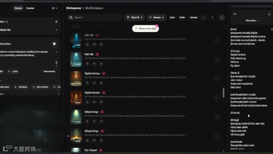 第三步:生成音乐。作者用的是Suno。这里有一个窍门,用Suno的“Simple模式”其实比“Custom模式”更好用,因为它可以输入超过200个字符的指令。把风格预设调好,把ChatGPT写的歌名和副歌往里一贴,几分钟功夫,带吟唱、带呼应、甚至带格列高利圣咏风格的曲子就出来了。