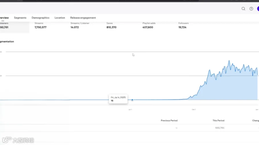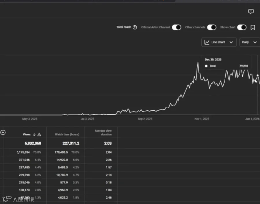 分享一个用AI音乐变现的案例。过去几个月,作者用AI音乐赚了近3万美元,变现平台是Spotify,可以看到最近一笔有3800多美元进账。差不多每千次流媒体播放有3美元。