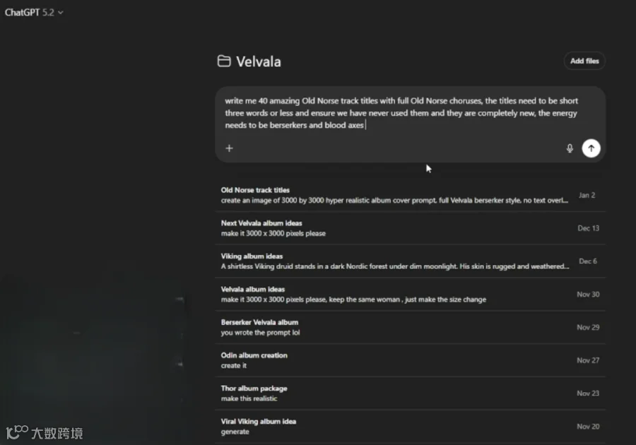 然后ChatGPT生成歌曲标题,最好在同一个对话里面完成,比如这个项目叫做Velvala的歌,这样AI能对之前的对话有记忆,避免重复歌名。我让它生成40个标题,因为一次能上传35首歌,多生成些就有挑选空间。