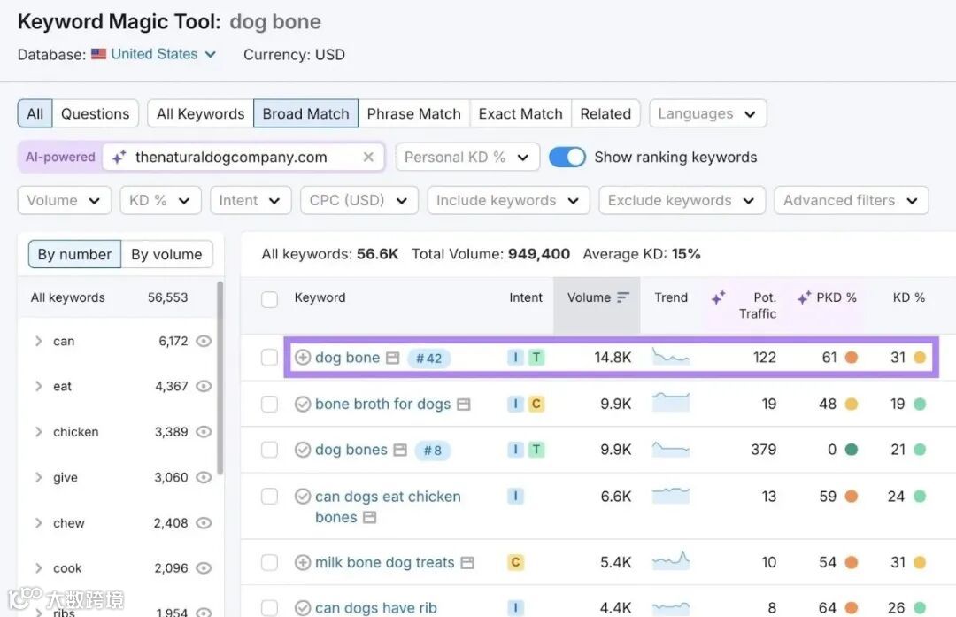 在下面的例子中,“dog bone”可能不是最佳目标词,因为该网站的个人关键词难度得分为61%。因此,该网站不太可能进入前几名。