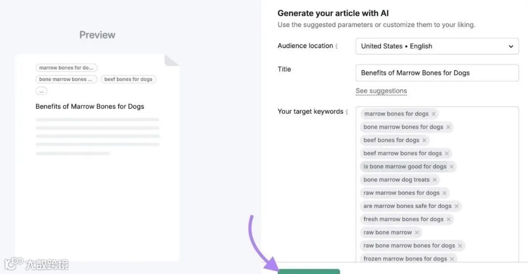 这会把你的关键词发送到内容工具包。点击“创建文章”,工具将开始生成你的草稿。