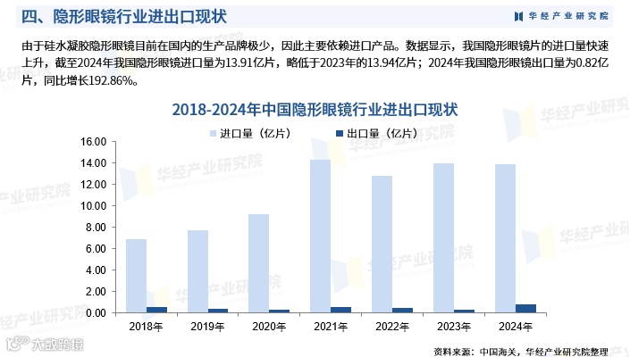 目前硅水凝胶材质产品在国内生产较少,主要依赖进口。2024年隐形眼镜进口量为13.91亿片,较2023年略有下降;出口量则大幅增长至0.82亿片,同比增长192.86%,显示出国产品牌出海潜力。