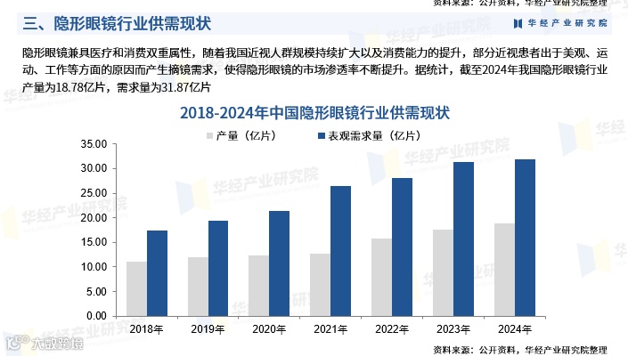 隐形眼镜兼具医疗与消费双重属性,随着我国近视人群不断扩大及消费能力提升,出于美观、运动或工作需求的“摘镜”意愿增强,推动市场渗透率稳步上升。数据显示,2024年我国隐形眼镜行业产量达18.78亿片,需求量达31.87亿片。