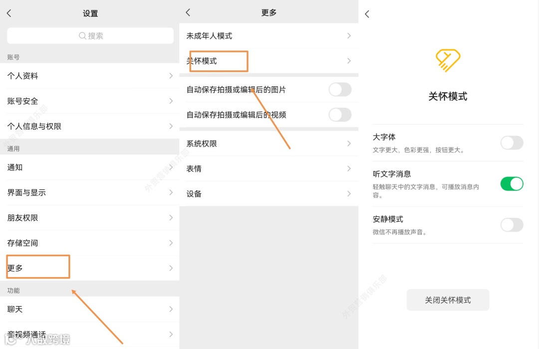 2.微信语音自动翻译设置流程:我→设置→更多→关怀模式→听文字信息