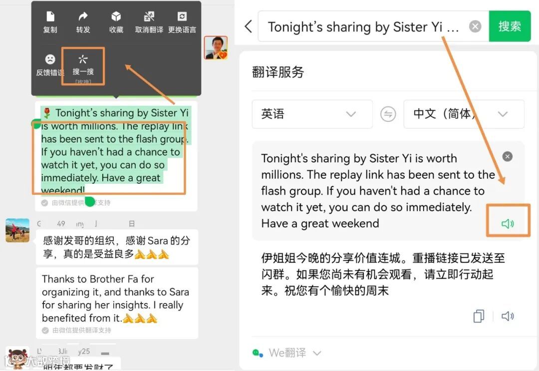 每个沟通的页面不论是是语音、还是中文沟通,无缝衔接生成中英文的内容,需要听发音,直接长按对应内容,选择搜一搜,然后就有语音播放,如上图所示。把每一次中文交流,也都能当成英语口语的训练场!