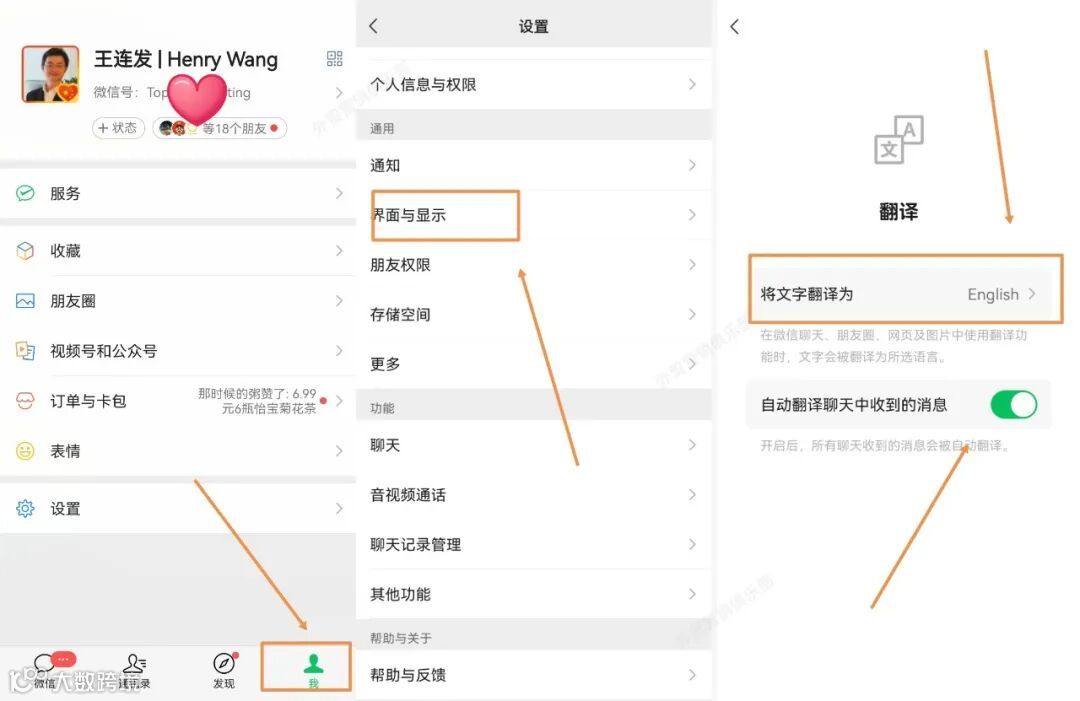 1.微信文字自动翻译设置流程:我→设置→界面与显示→翻译→将文字翻译成想要的语言,总共18种语言(开始自动翻译)