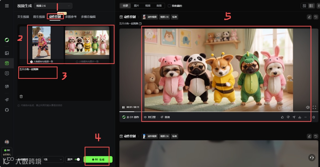 - 在对话框输入具体动作指令(例如:“5只狗一起跳街舞”)