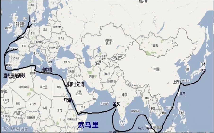 注意事项:苏伊士运河通行费高且有船舶尺寸限制;受红海危机影响,部分船舶绕行好望角,运输成本与航程显著增加。