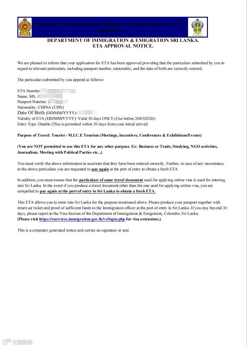 停留期限与延期规则:单次入境最长停留30天,如需延长停留,可在斯里兰卡境内向移民部门申请,最长可延期至90天。商务 ETA 则支持 30 天内多次入境,需额外提供商务活动证明材料。