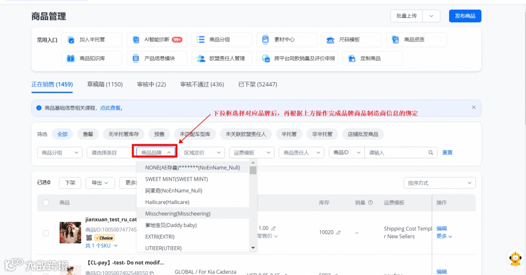 2)制造商信息关联:请尽快提供商品的制造商信息和关联店铺内对欧销售的在线商品(建议通过商品管理页面-品牌筛选关联对应的制造商),同时需要将制造商信息体现在商品实物标签中。