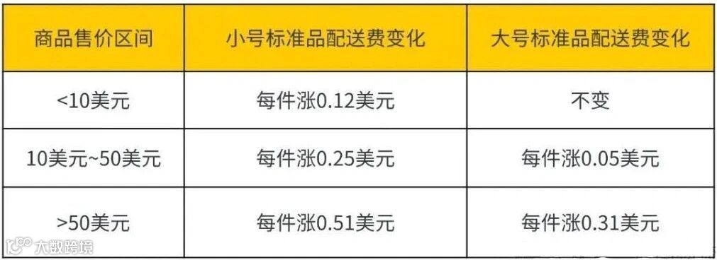 • 标准尺寸商品:若采用"单仓入库"模式,单件商品平均附加费上调0.05美元;