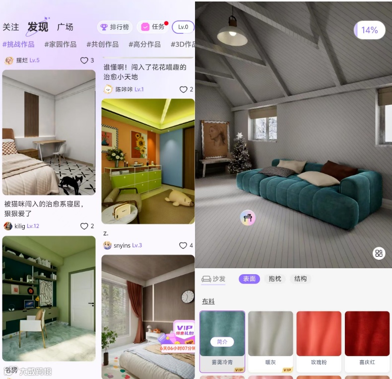 用户可以通过高度定制化的功能,自由选择墙面、地板、沙发、桌子等设计素材,并自定义材质、颜色和纹理,实现沉浸式的美学创作。此外,APP还提供任务、排行榜、设计挑战及多人创作等特色功能,满足用户的社交需求。