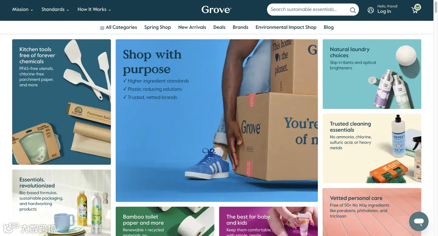 Grove Collaborative销售环保家居日化产品,包括清洁用品、个人护理用品和其他必需品。品牌特色是使用植物成分,用铝制容器替代传统塑料包装,并提供补充装售卖,减少一次性包装的浪费。