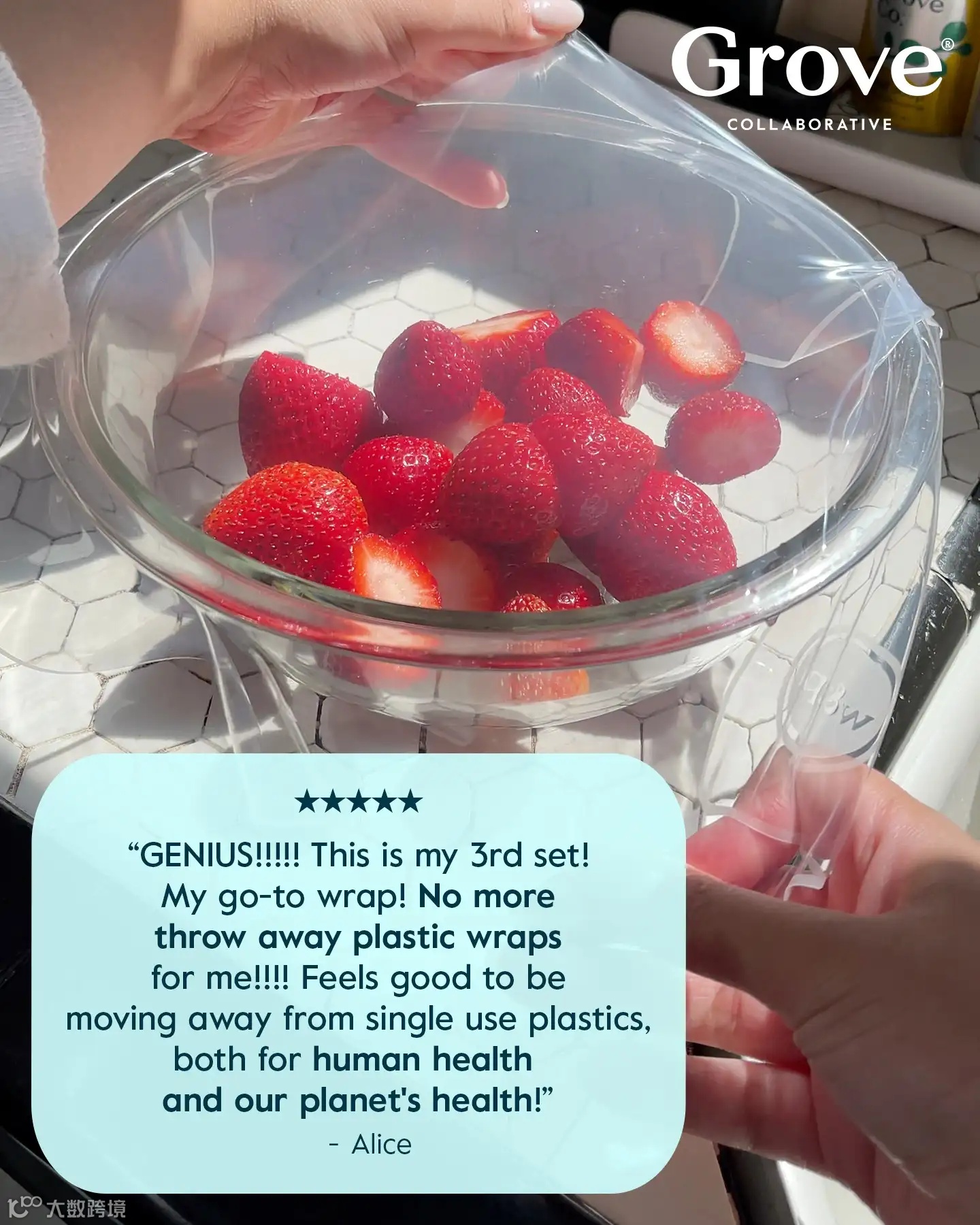 近期最新广告是推广用于厨房的可持续产品,用一张图片素材展示使用保鲜膜+玻璃碗储存新鲜水果的效果。文案则强调优惠的价格和符合可持续标准的产品特性。