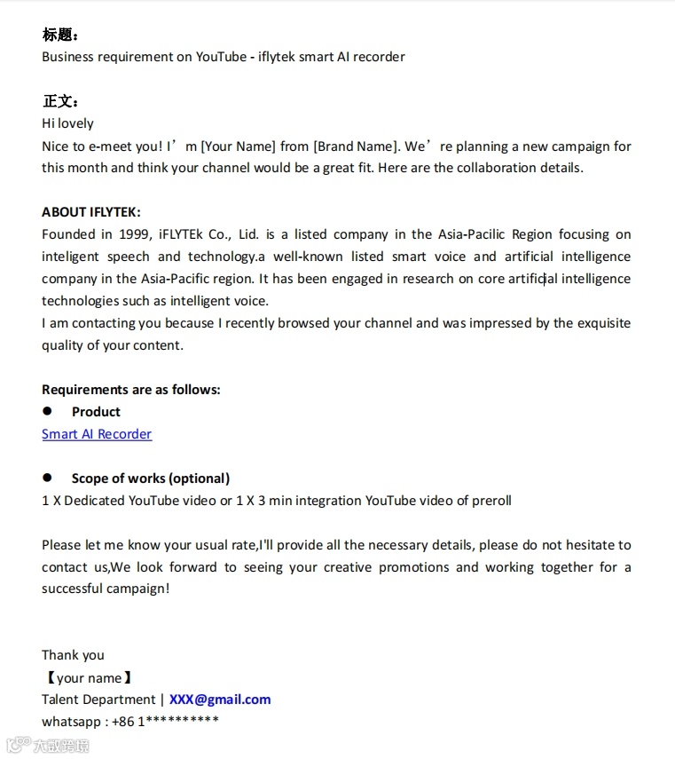下面是我们运营同事为科大讯飞旗下其中一款产品,建联YouTube红人的建联邮件模板,大家可以参考一下: