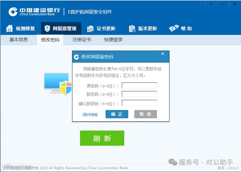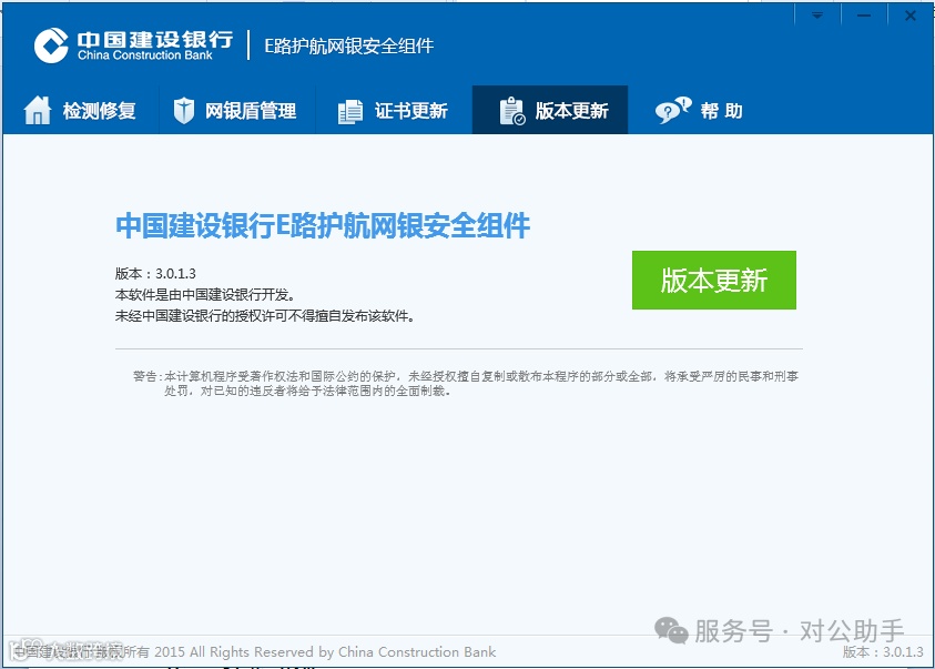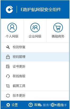 一、产品简介中国建设银行E路护航®网银安全组件集成了网银盾驱动、安全控件、密码保护、检测修复、证书管理及版本更新等多项功能,通过“所见即所签”技术,有效防范木马病毒攻击,提升个人与企业网银操作的安全性。 二、适用对象