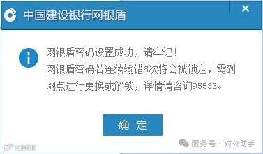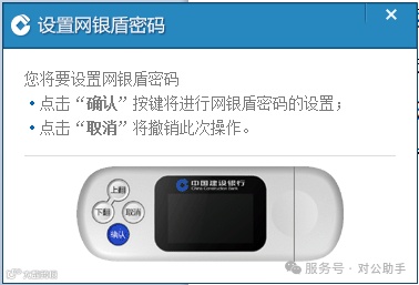 4. 按照页面提示,在网银盾设备上点击“确认”键完成密码设定,并查看安全提示。