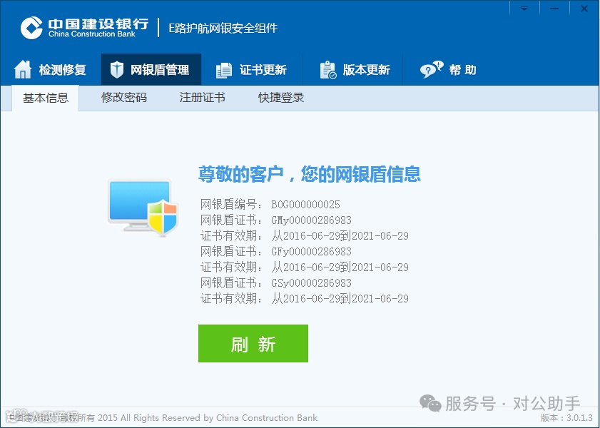 2. 网银盾管理:进入“网银盾管理”页面,可查看证书号、修改密码等。