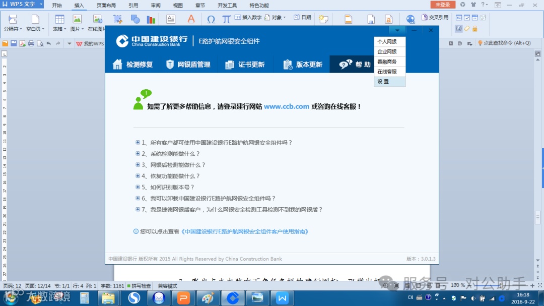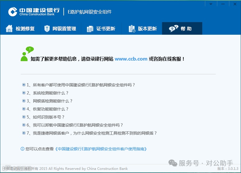 2. 检测修复功能仅针对影响建行网银使用的环境设置,不涉及其他系统配置。