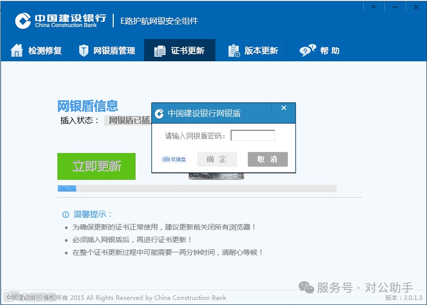 3. 插入网银盾,系统弹出密码设置提示,输入新密码并确认。