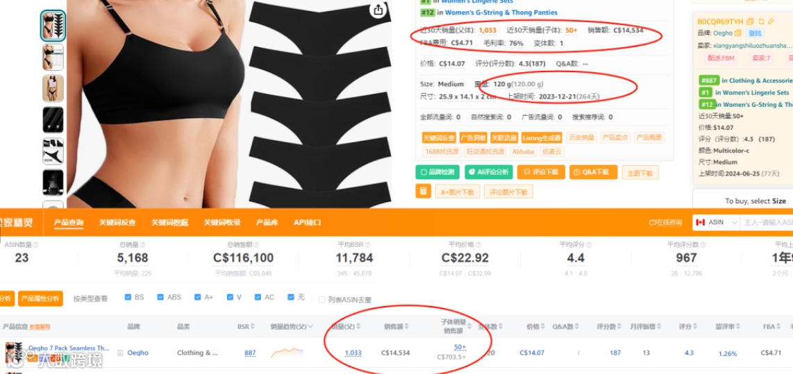 单量:在卖家精灵中显示上架时间是2023年12年21号,目前为止持续销售264天,30天销售量父体(1033),子体销量(50+)