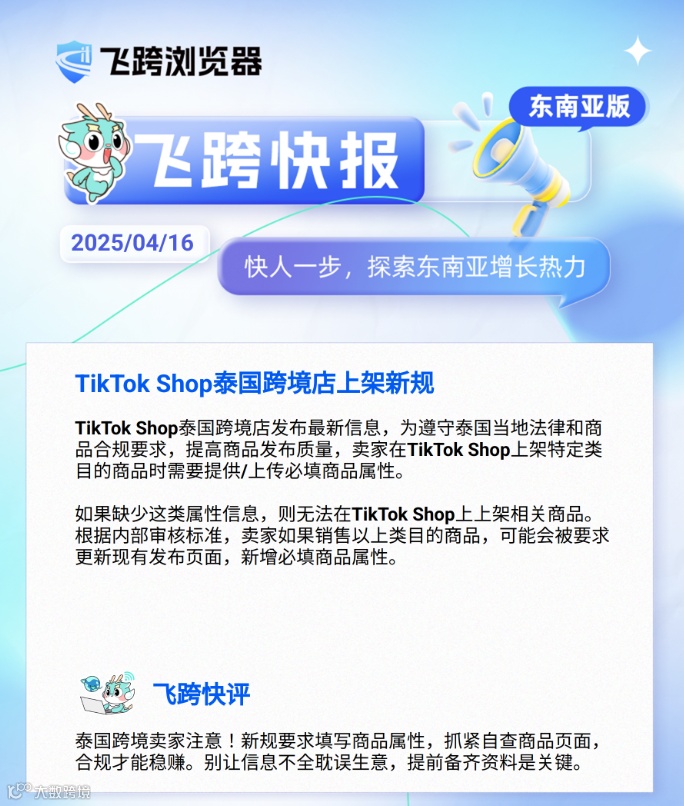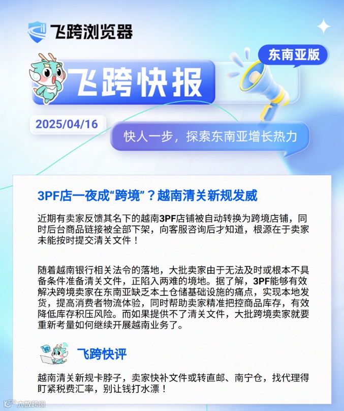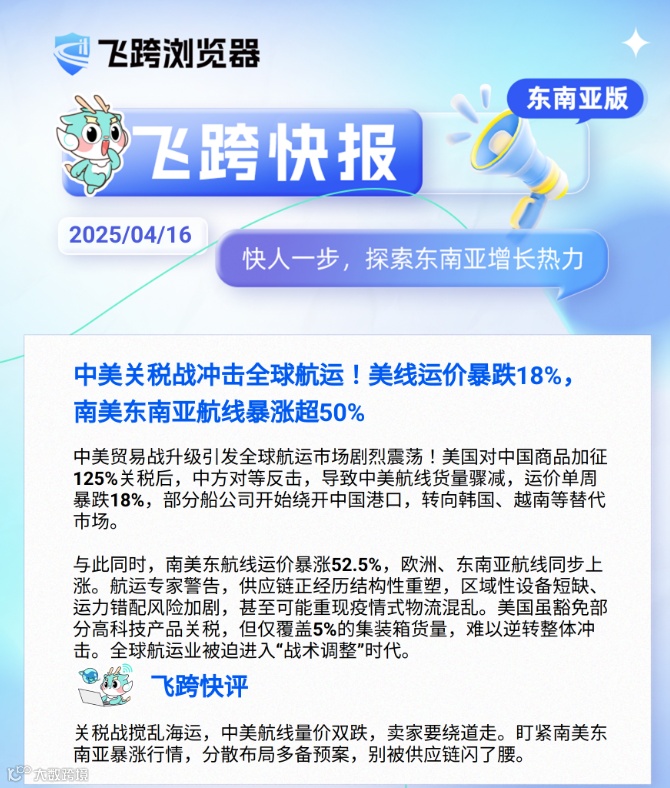 导读:4月16日【飞跨东南亚快报】 ✅3PF店一夜成“跨境"?越南清关新规发威 ✅关税战冲击全球航运!南美东南亚运价涨超50%,美线暴跌 ✅TikTok Shop泰国跨境店发布上架新规