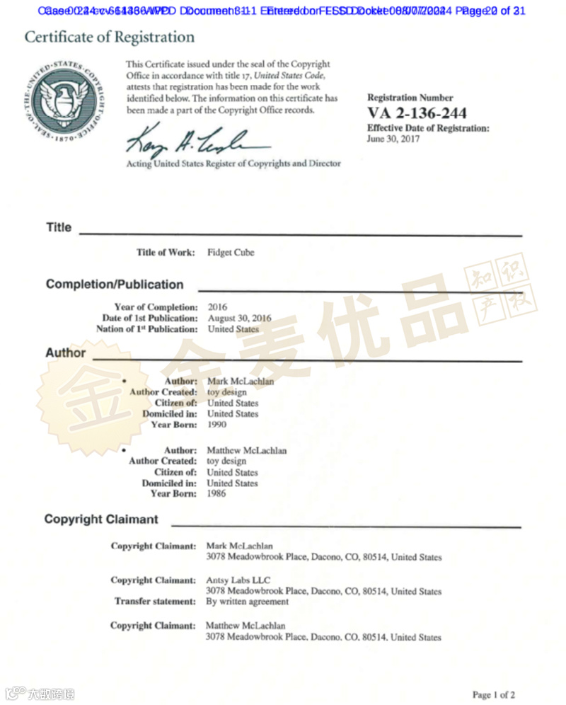 2024年8月7日,Boies Schiller Flexner LLP律所代理Antsy Labs, LLC对旗下的解压魔方FIDGET CUBE发起版权维权,案件号:2024-cv-61436,初步禁令听证会将于 2024 年9月 12 日进行,本案涉及FIDGET CUBE 减压魔方的版权维权,Fidget Cube 减压魔方,是一款可以用来舒缓压力,增强集中力,提高思考能力的新奇产品,它由一个六角立方体构成,每个角上零件颇多,如按钮,拨盘,滚珠等小配件。这些小配件在用户反复操作时,能够帮助使用者缓解压力,舒缓紧张情绪,提高集中力,尤其在办公室工作者和学生群体中备受青睐。Fidget Cube象征着当今许多人的工作和学习生活状态,人们需要在高度压力和高强度的工作和学习环境中进行工作和学习,而Fidget Cube就是一种可以帮助人们舒缓压力,增加集中力的工具。产品官网:www.antsylabs.com,原告注册了一系列商标、专利等知识产权,用以保护其产品的独创性和市场地位。卖家在未经授权的情况下,不能上架相关的产品,避免侵犯其知识产权。