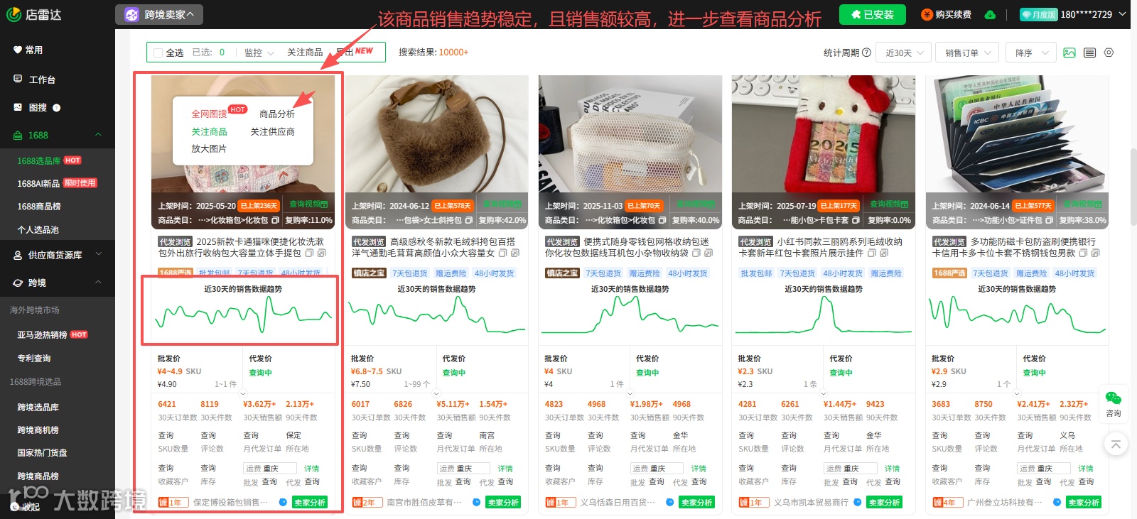 掌握了核心判断要素后,我们可以通过店雷达选品工具进行数据判断,找到“趋势+销售额”双优商品,以选择箱包类目为例,筛选后看到一款销售额较高且销售趋势稳定的HelloKitty化妆收纳包,点击商品分析后可看出,这个商品 符合“销售额高 + 趋势持续活跃” 的特征,同时该商品在10月份出现销量高峰,之后有所回落,但 并未归零,随后在12月及近30天再次上升——这种“波动+复苏”的曲线,往往对应促销活动或季节性需求变化,反而更加真实。
