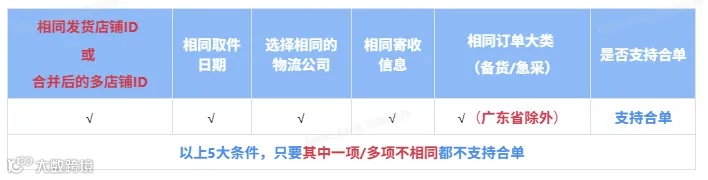 为帮助商家节省运费,满足以下5大条件,可合并为一个总计重量进行结算,即合单计算: