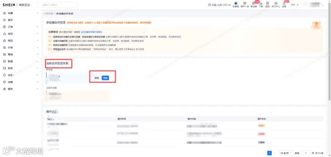 注:一个店铺可以接受N个店铺发起的多店铺合并发货关系申请。