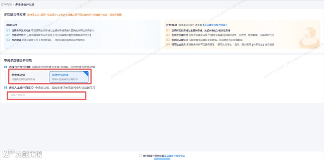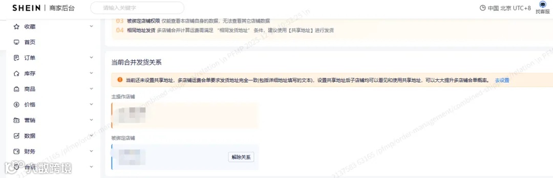 统一地址:成功绑定后,为提高合单率,所有店铺发货时必须100%使用主店铺设置的【共享发货地址】,这是合单成功的基石。