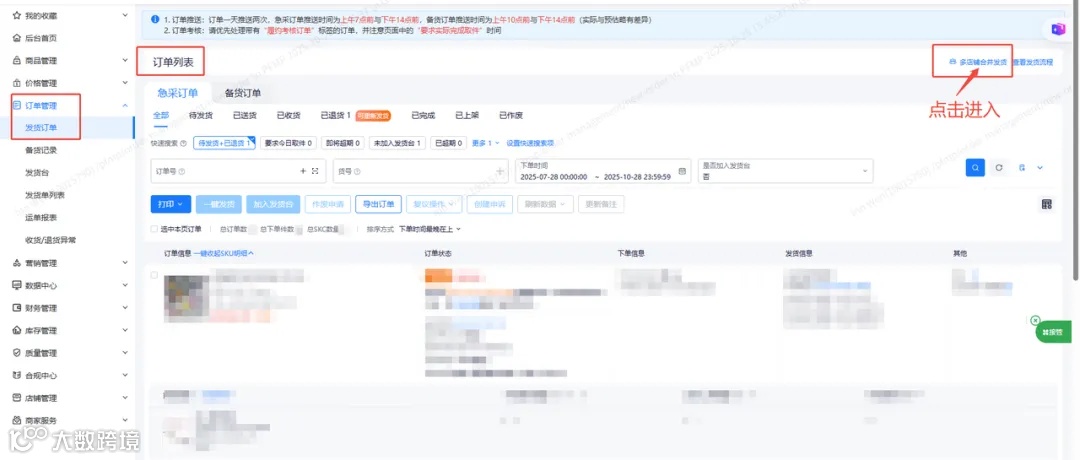 进入路径:【订单管理】→【发货订单】→【订单列表】→找到并点击【多店铺合并发货】功能入口;