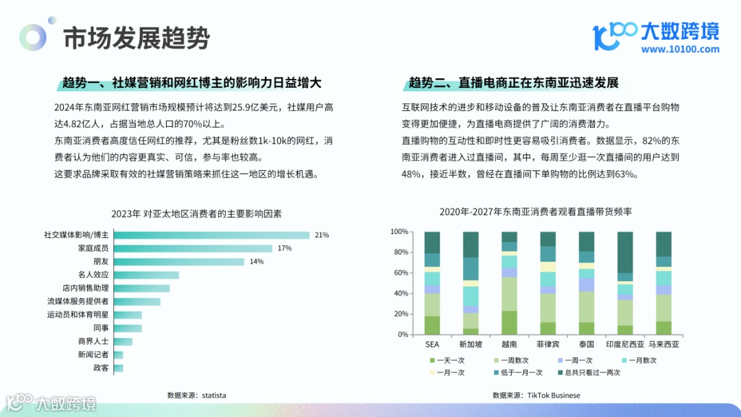 东南亚电商市场的发展趋势则主要包括社媒营销和网红博主的影响力日益增大、直播电商正在东南亚迅速发展、高价值消费者成为数字消费的主力军、东南亚电商市场呈现出多元商务模式这几个方面。