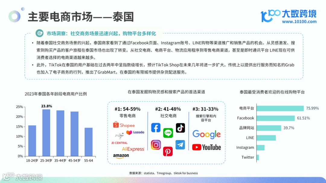 泰国在2023年东南亚互联网经济规模方面仅次印度尼西亚,排名第二,高互联网普及率和趋向成熟的人口年龄结构,促进了当地电商市场的蓬勃发展。