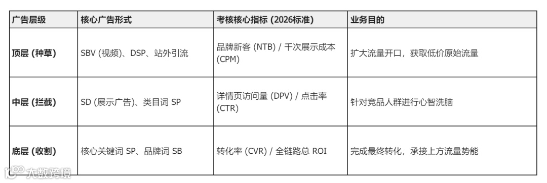 BOFU(终端收割层 40%):SP精准、品牌词。指标:最终成交转化率(CVR)、全链路ROI。
