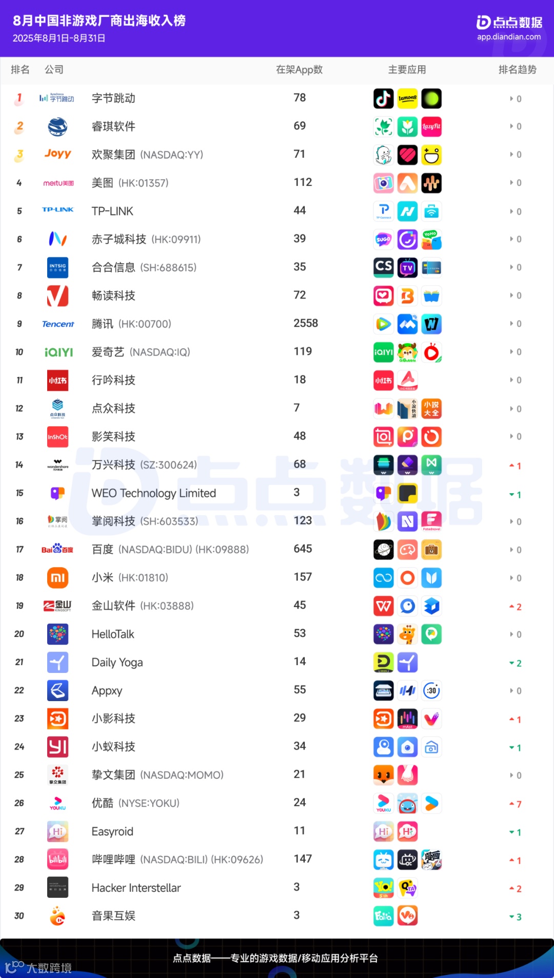 基于App Store和Google Play两大应用市场数据,点点出海依托互联网移动应用大数据平台“点点数据”(https://app.diandian.com/),发布《2025年8月中国应用&游戏出海厂商Top30收入榜》,全面呈现中国移动应用在海外市场的表现趋势。
