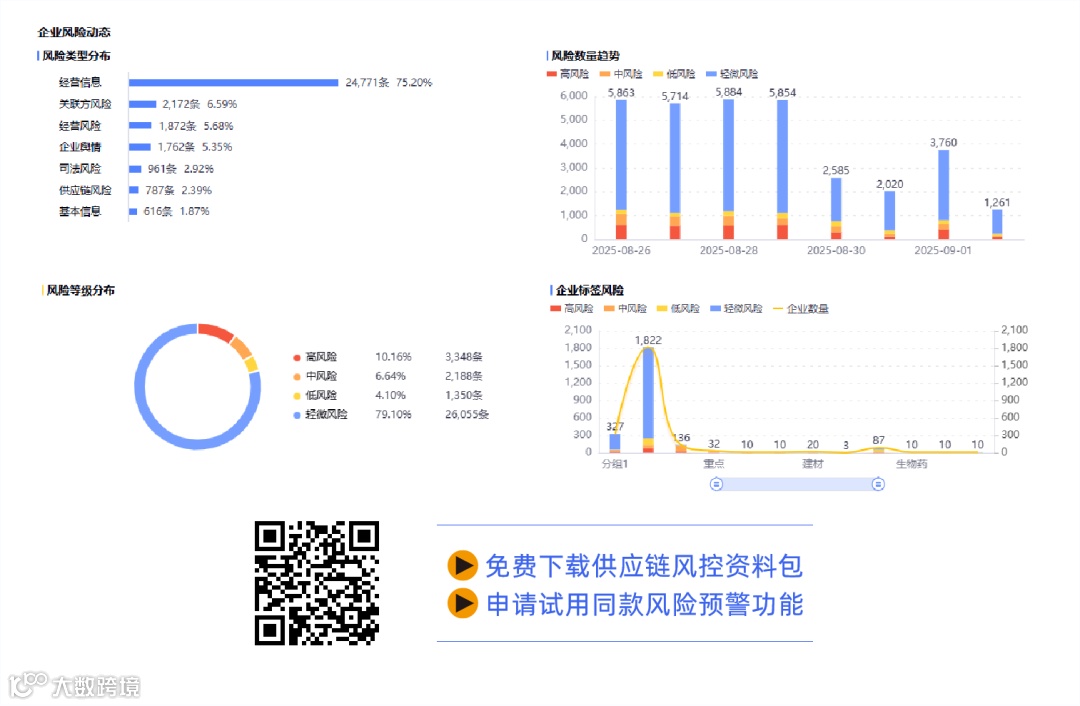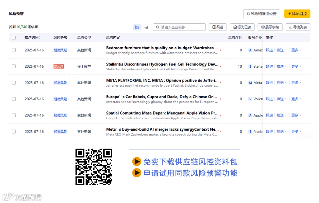 针对传统供应商风险管理手段局限性,启信慧眼升级供应链风控方案,全面覆盖自然灾害(如地震、洪水)、合规风险(出口管制、环保处罚)、经营状况(信用下降、裁员)、物流交通风险(港口/机场关闭)以及产能不足、价格波动等影响经营稳定性的负面信号,帮助企业及时识别潜在断链风险。