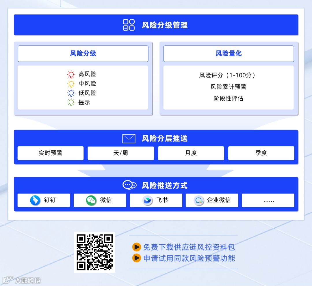 为提升响应效率,启信慧眼完善风险推送机制,支持对供应商基本信息、司法诉讼、失信记录、舆情动态等数百项指标进行实时监控。企业可依据自身偏好将风险划分为“高、中、低、提示”等级,或进行量化评分,实施风险分层监控,如高风险实时预警、中风险按日/周推送,并可将警报同步至钉钉、飞书、企微等办公系统,把握应急窗口期。