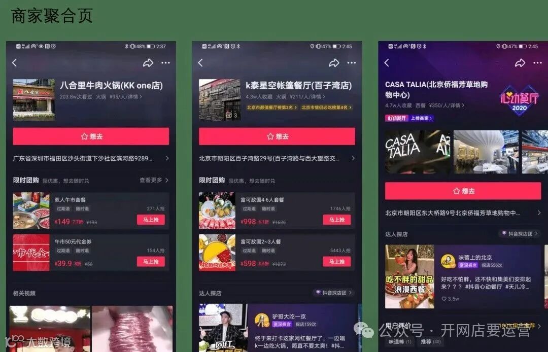 商家页面包含:基础信息、达人视频置顶、优惠券发放、用户评价及关联内容聚合。
