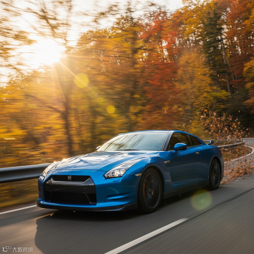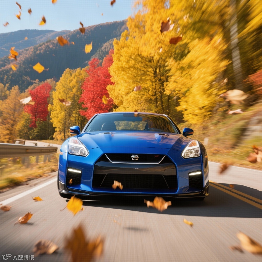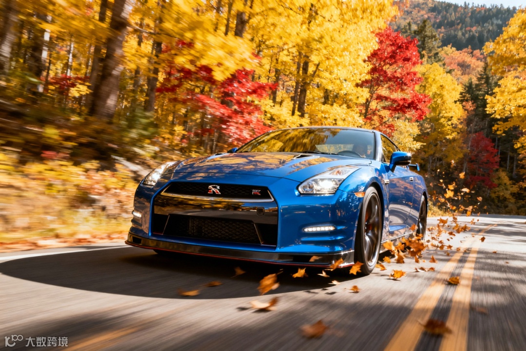 生成一辆飞驰于秋日山路的日产GTR R35,强调动态模糊、车身反光与低角度构图。