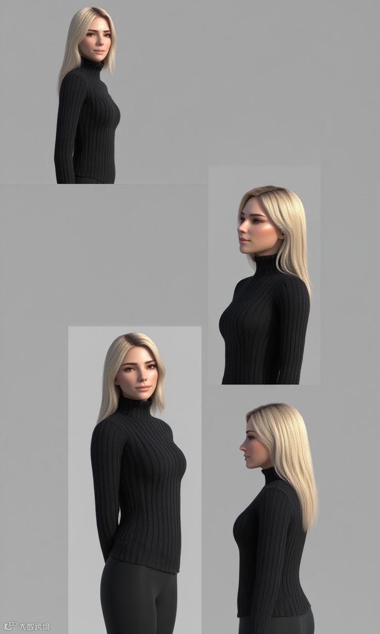 根据一张女性照片生成正、侧、背三视图,要求完全一致的服装与发型。