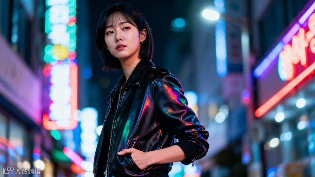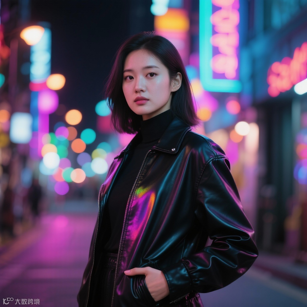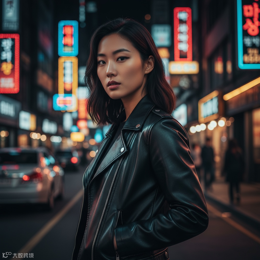 提示词描述一位夜晚站在城市街头的韩国女性,身穿黑色皮夹克,背景为霓虹灯光与焦外光斑,要求电影级质感。