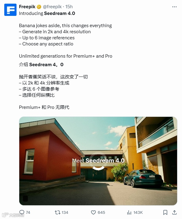 在Google的Nano Banana热度未减之际,字节跳动Seed团队正式推出全新升级的AI图像生成模型Seedream 4.0。该模型首次支持4K多模态生图,兼容文本与图像组合输入,实现文生图、图生图、图像编辑、多图融合等多样化创作功能。相比3.0版本,其推理速度提升超10倍,具备更强的指令理解能力,广泛适用于电商营销、商业设计、影视动漫等领域。