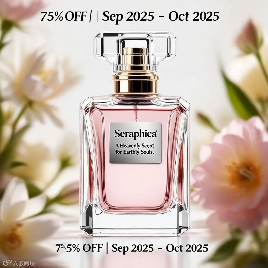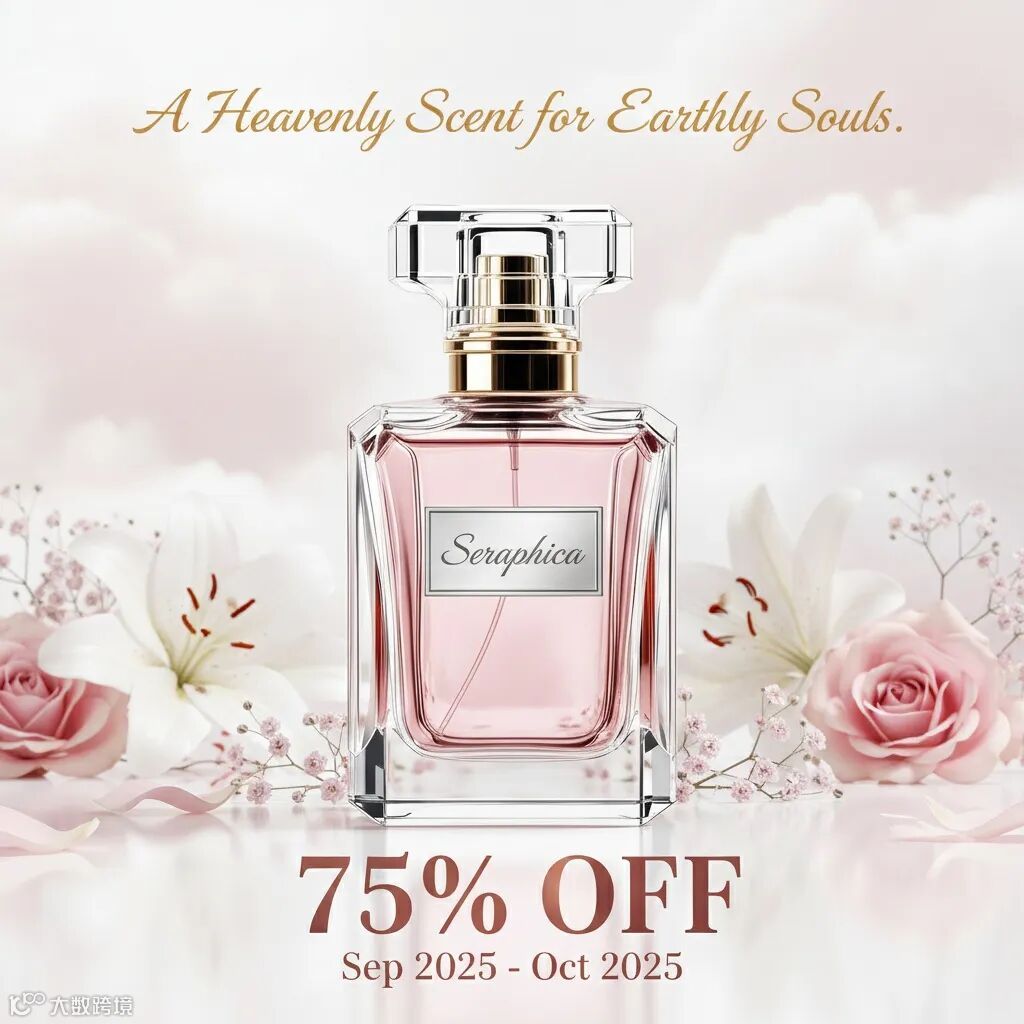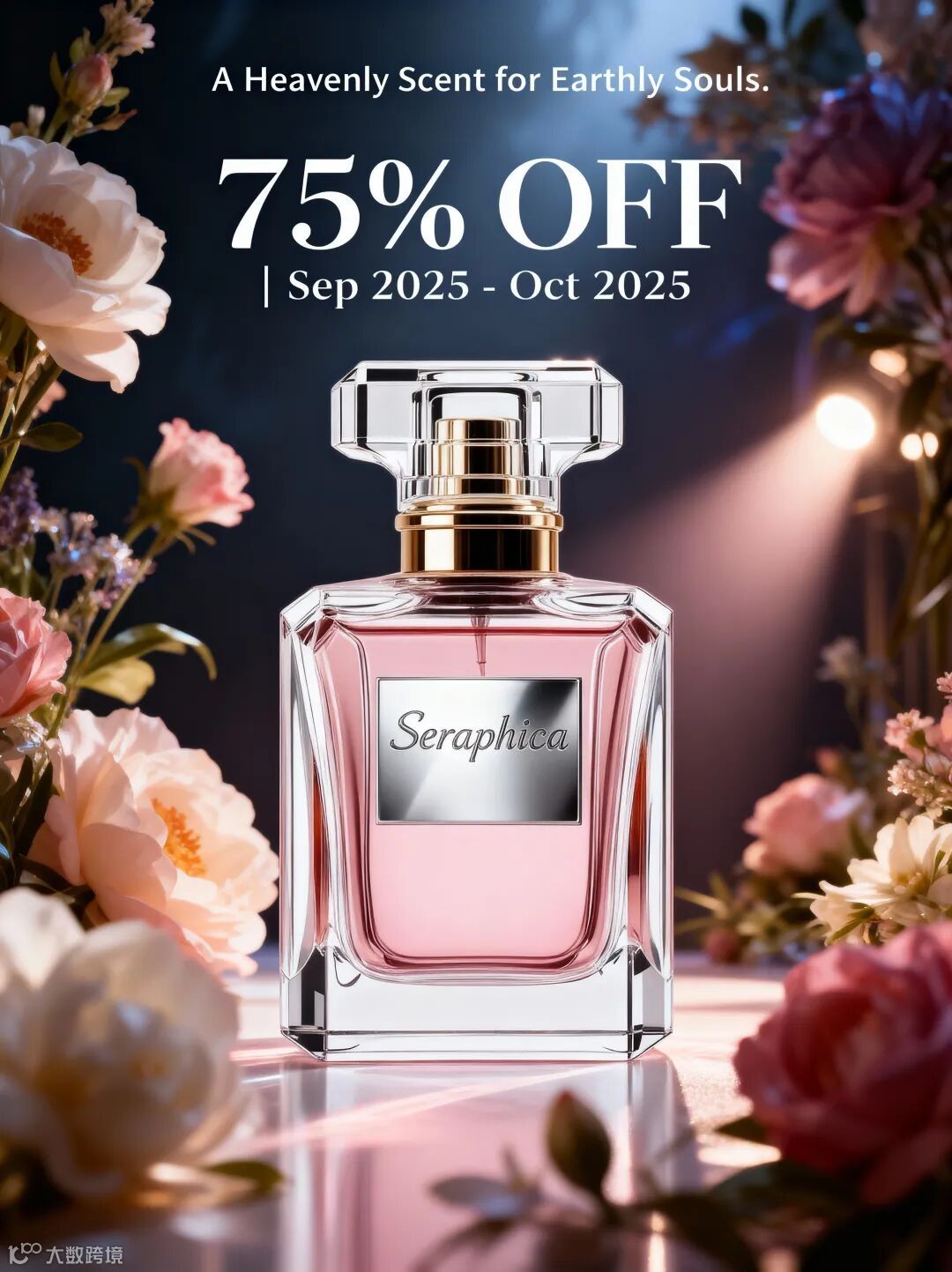 为香水瓶添加品牌标签“Seraphica”,并生成含标语与促销信息的宣传海报。