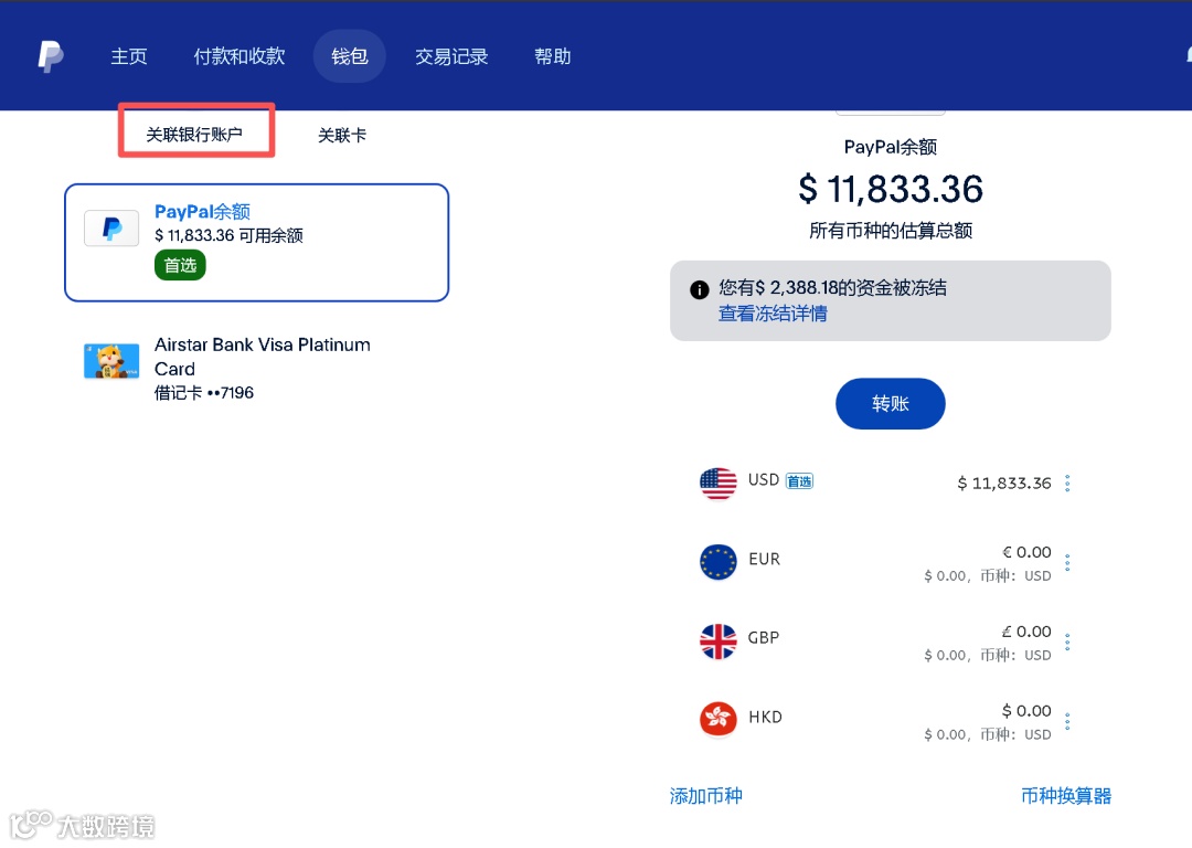点击PayPal后台【钱包】、点击【关联银行账户】