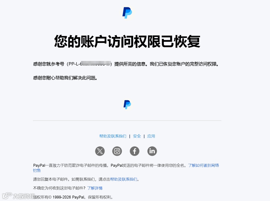 经过我一些“手段”解救了PayPal账户之后,收到账户恢复通知,整个人精神起来!