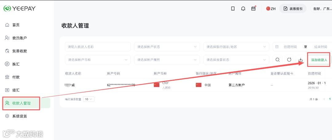 然后把入金到自己的银行卡,只需要在收款人管理那里添加你国内的银行卡账户,我这里是添加了工行的,然后把你Yeepay的钱转出即可!